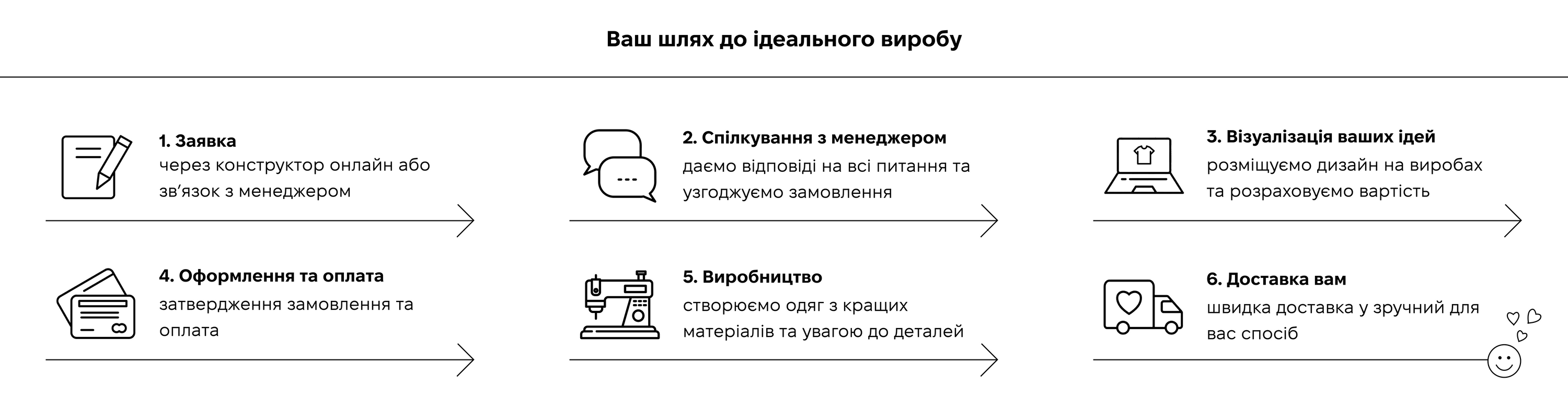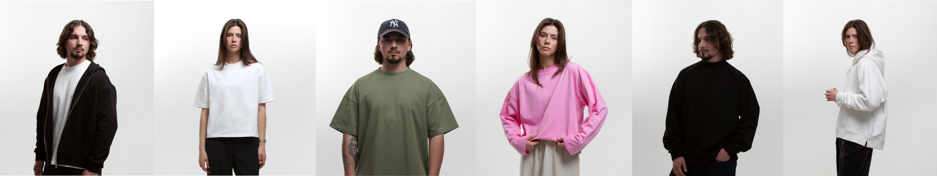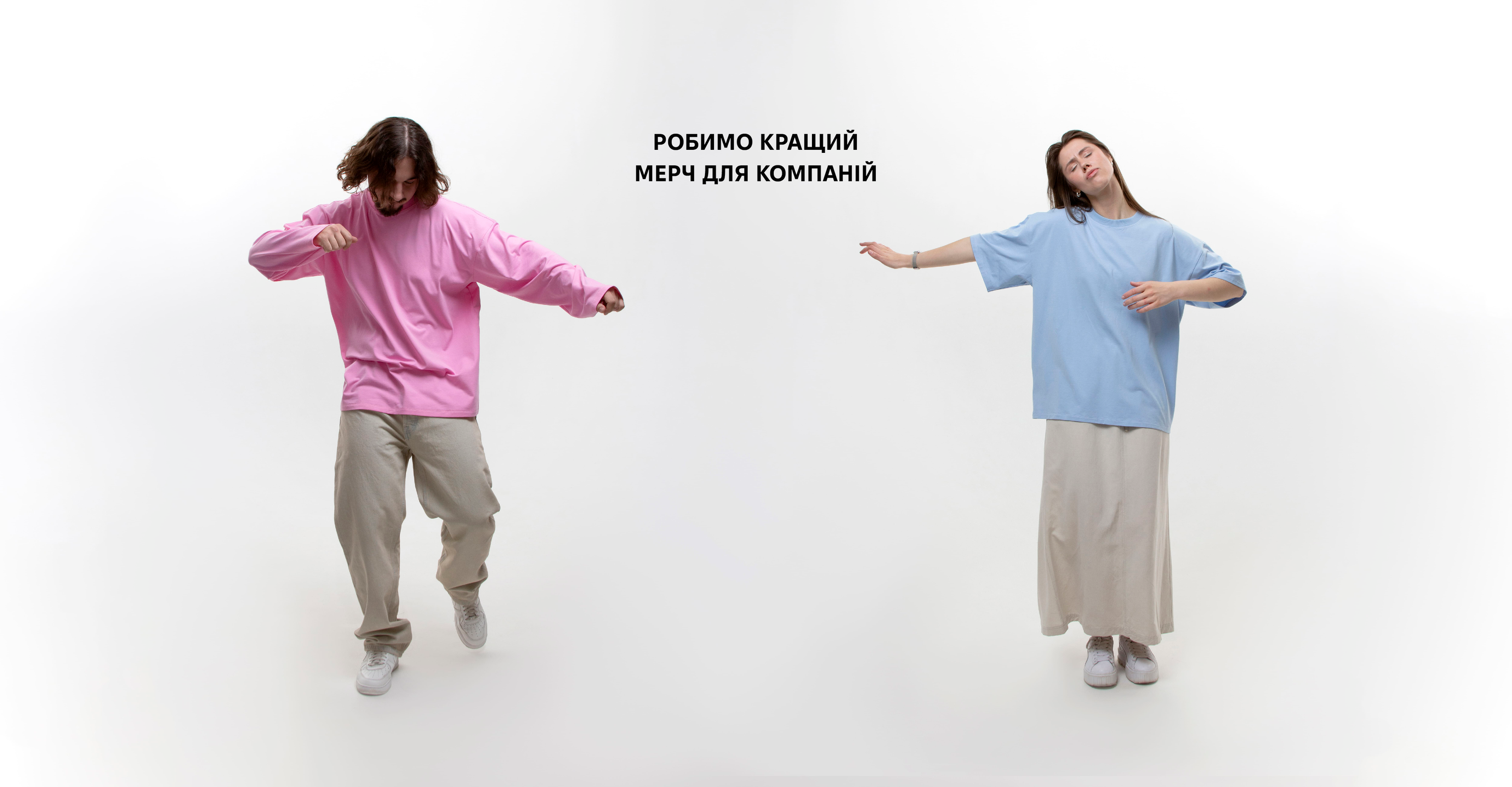 оптові замовлення і створюємо мерч для клієнтів під ключ. Обираємо найкращі тканини та унікальні фасони для ваших виробів, більше 20 кольорів на вибір для них. Переходь у конструктор або дивись каталог, щоб обрати бажане.